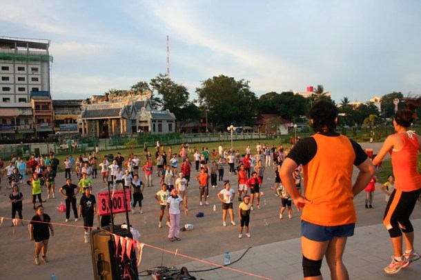 I found myself surrounded by thousands of smiling Laos’ (the people that live there. ) All of them had smiles on their faces and most were laughing with each other. Some were playing on the playground with their children. Some were playing badminton (you know that game that’s kind of like Tennis but played with a birdie). Some were working out with two hundred of their closest strangers in giant aerobics classes (More on that later as these were a riot). Some were stuffing their face and drinking beer while others were simply enjoying themselves along the picturesque Mekong River.
