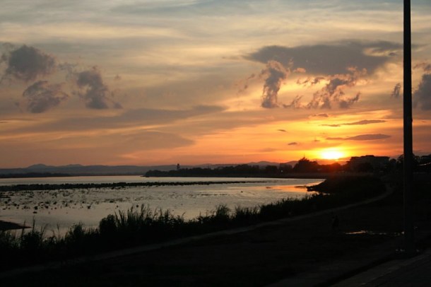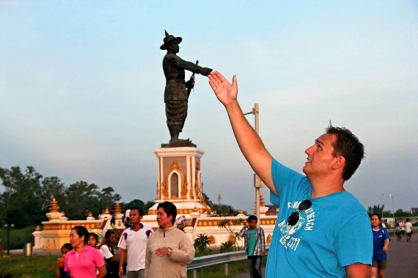 As the sun began to set we pried the boys away from the park and headed toward a large statue. It was roughly thirty feet tall and was the image of a Lao man holding a samurai looking sword in its scabbard while reaching his hand out for an embrace. I was curious what this towering monument was all about so we trudged lazily to read the placard, enjoying the sunset along the way. As far as sunsets go, it was stunning. At this point of my life I have had the pleasure of seeing two sunsets over the Mekong river and I would say their beauty rivals any I have seen from anywhere in the world. There is something timeless about the river as men fish with hand lines and children race along the shore that only serve to add to its charm. By the time my family and I made it to the statue, it was official, we had all fallen in love with the Mekong River Park.